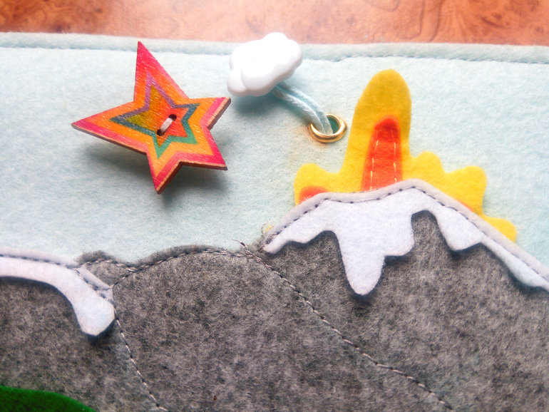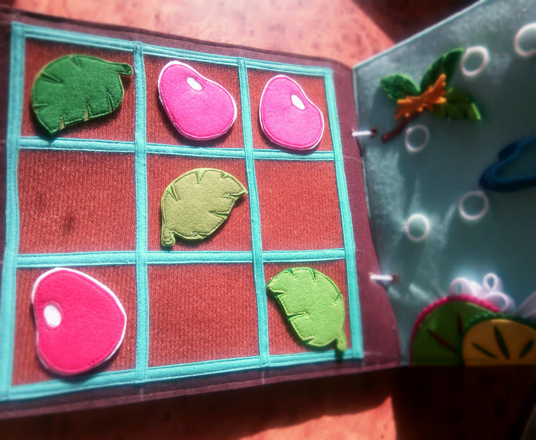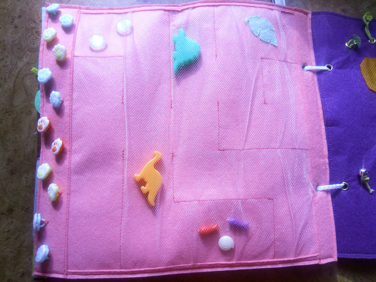 5. Разворот с играми, слева-лабиринт, в нем две фигурки динозавров, и несколько пришитых элементов- листик, рыбки, пуговки- типа водичка, Гришка любит этих динозавриков "кормить".