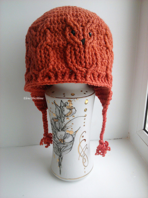 Сегодня нацепила доче шапку утром в садик)) а ей непривычно, она сама пытается на лоб натянуть.. так и придется довязывать)) и тесемки переделывать.. короткие очень))