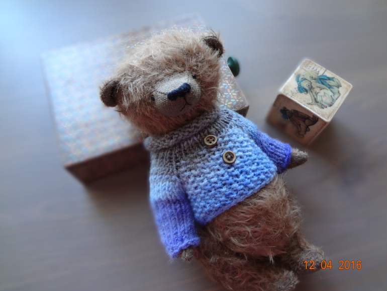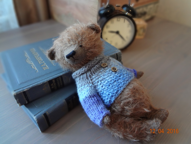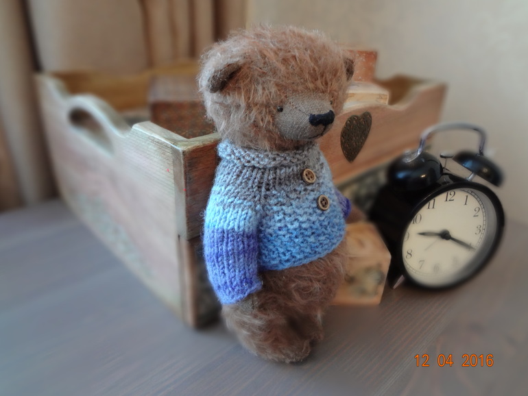 Тедди: мишки и их друзья.Мишка тедди Тихон сшит из мохнатого мохера. Набит плотненько опилочками,в животике металлический гранулят. Шплинтовое крепление,голова плавно покачивается. Тихон оделся в теплый свитерок связанный спицами. Мишка сшит полностью вручную с большой любовью и теплом. Авторская выкройка.