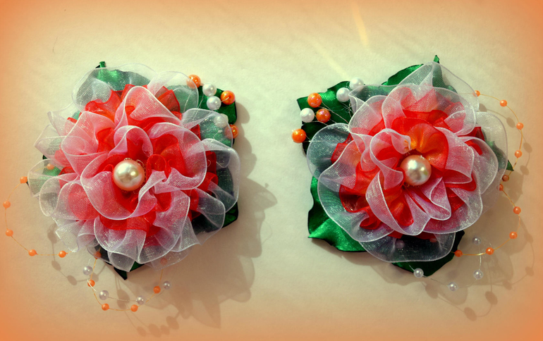 Розы - фомиран, ленты - органза, сетка и атлас, тычинки - готовая фурнитура.
