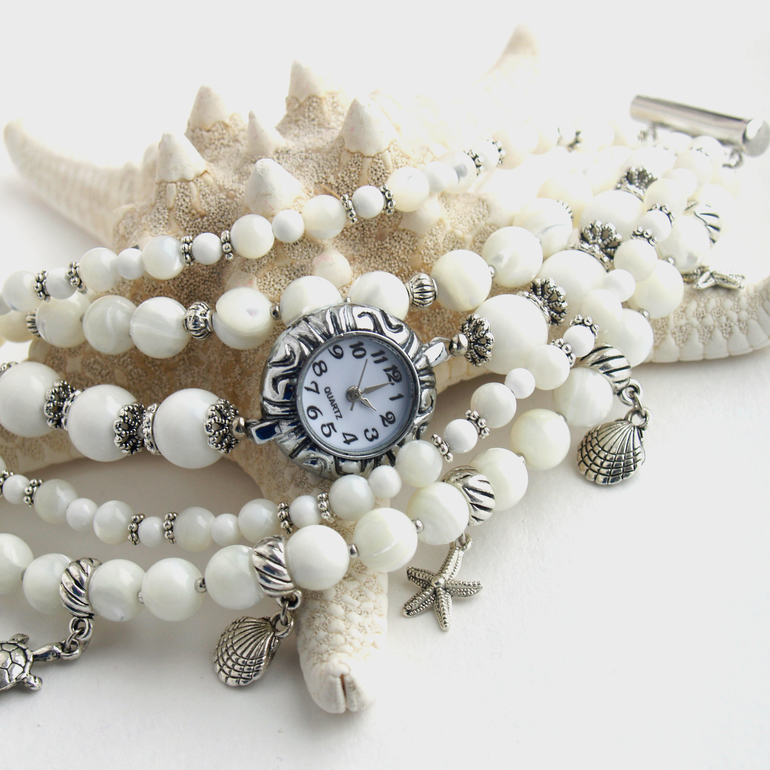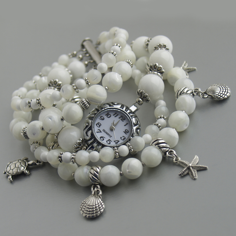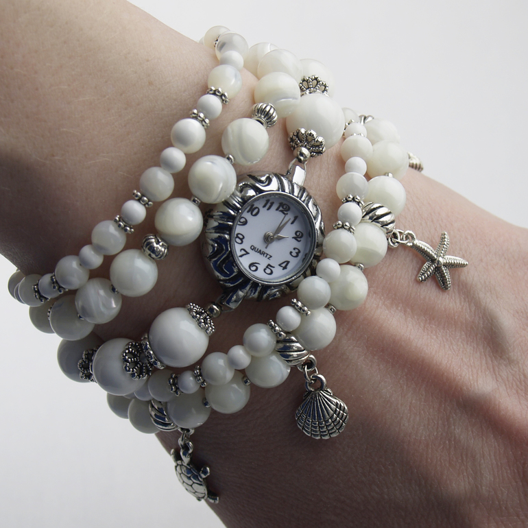 Часы собраны из пяти нитей перламутровых и агатовых бусин. Украшены подвесками в морском стиле.