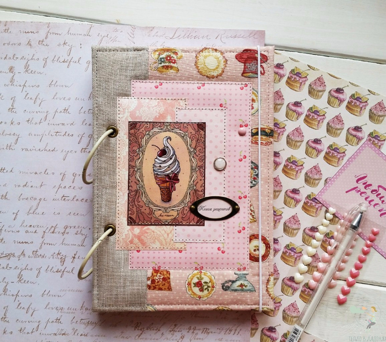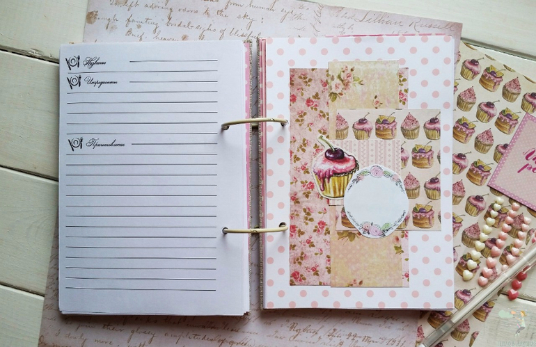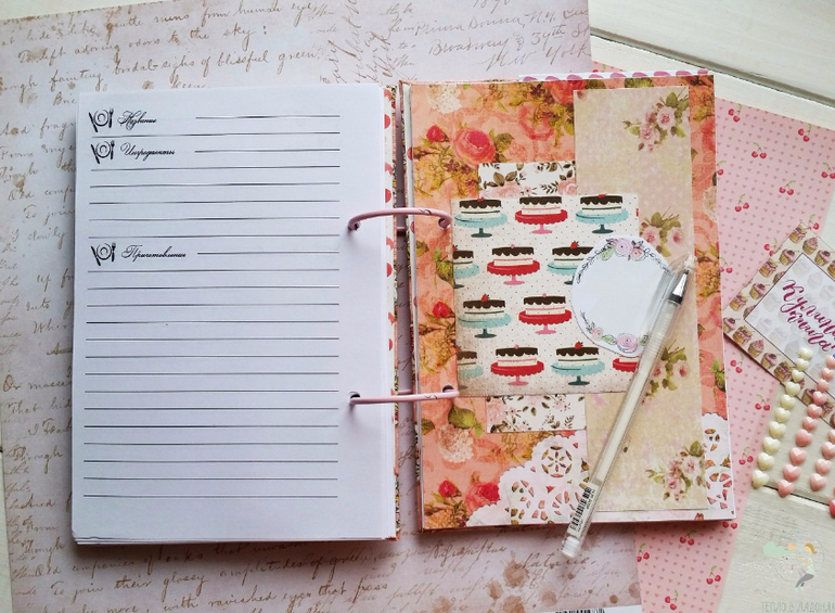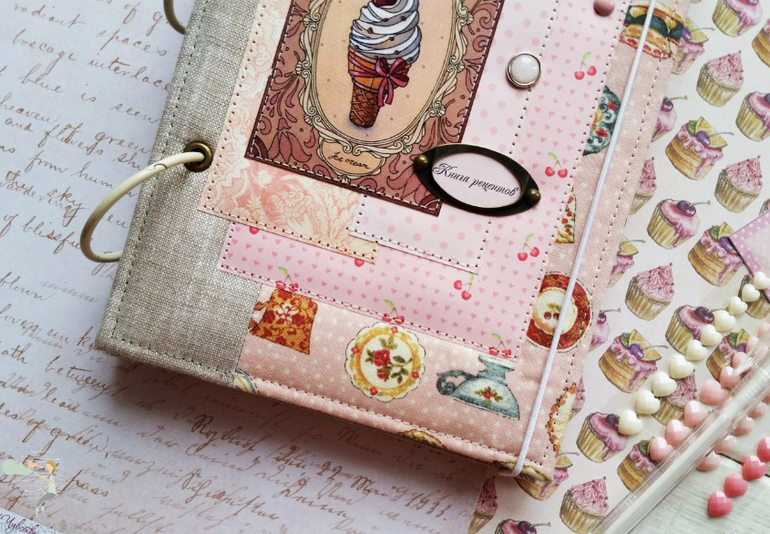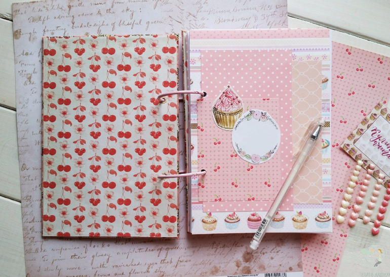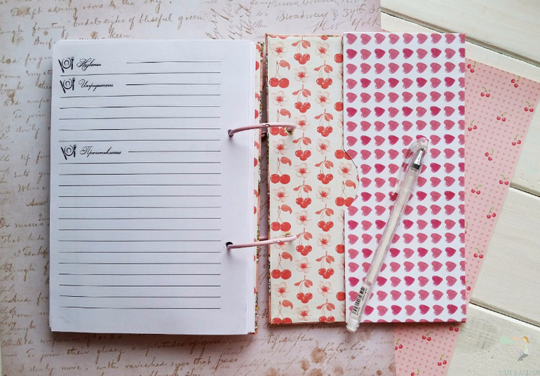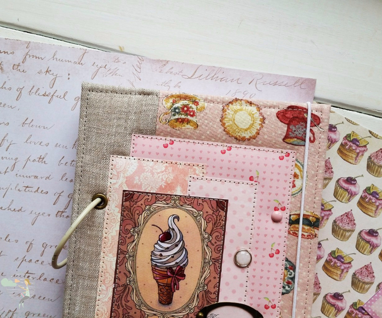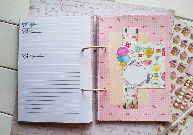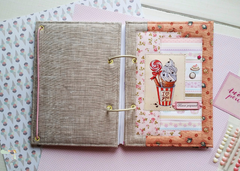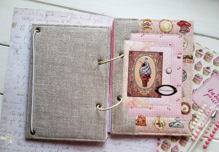 Обложка обтянута льном и хлопком или только хлопком. Разъемные кольца, которые позволяют вставлять дополнительно листочки/вырезки из журналов/распечатки.