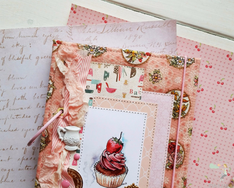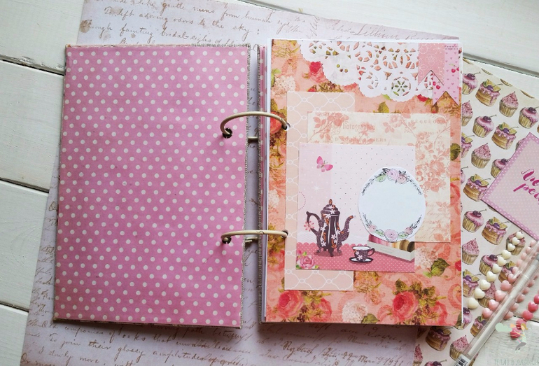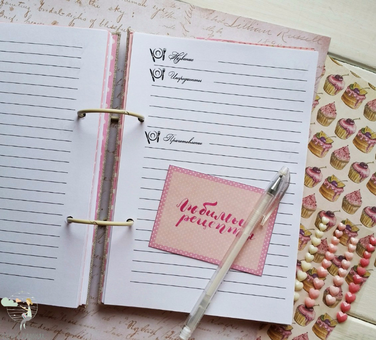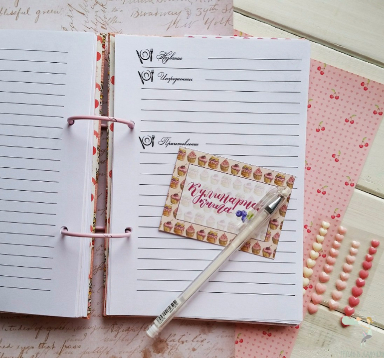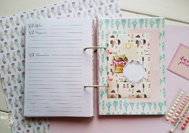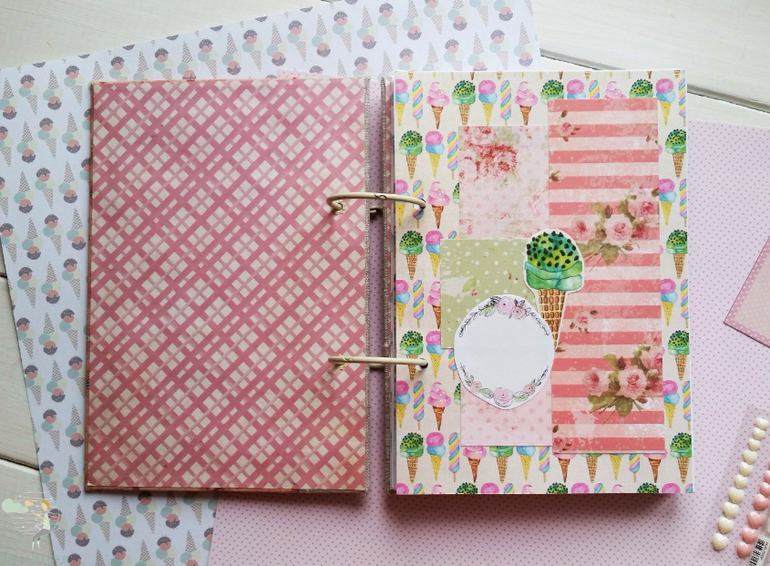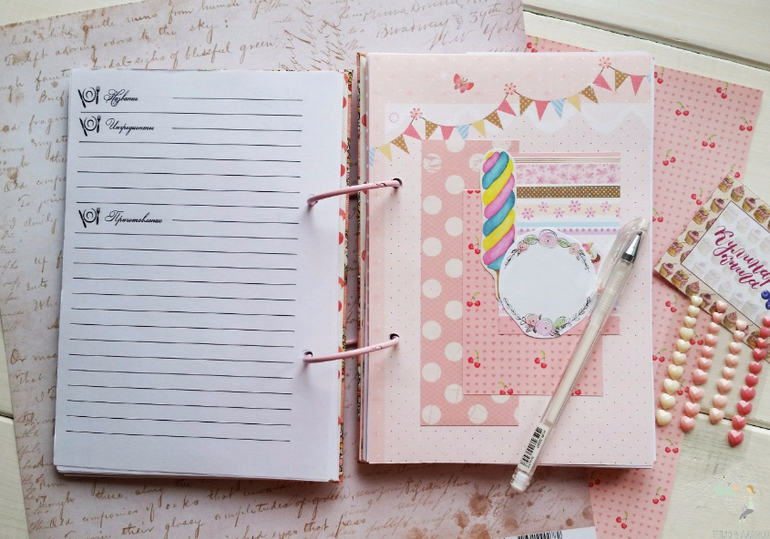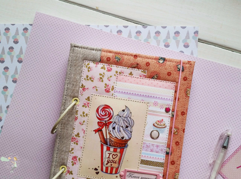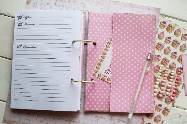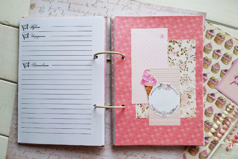 Обложка обтянута льном и хлопком или только хлопком. Разъемные кольца, которые позволяют вставлять дополнительно листочки/вырезки из журналов/распечатки.