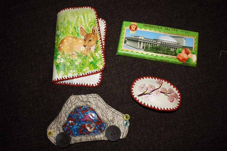 Искалочку-машинку, в кот я сама с радостью искала ее жителей ))) Красивую заколочку из кожи с цветами, кот Юлия сама нарисовала. И обложку на паспорт с ОЧЕНЬ красивым оленем !!!