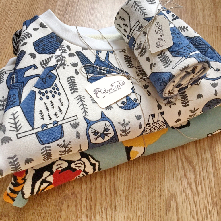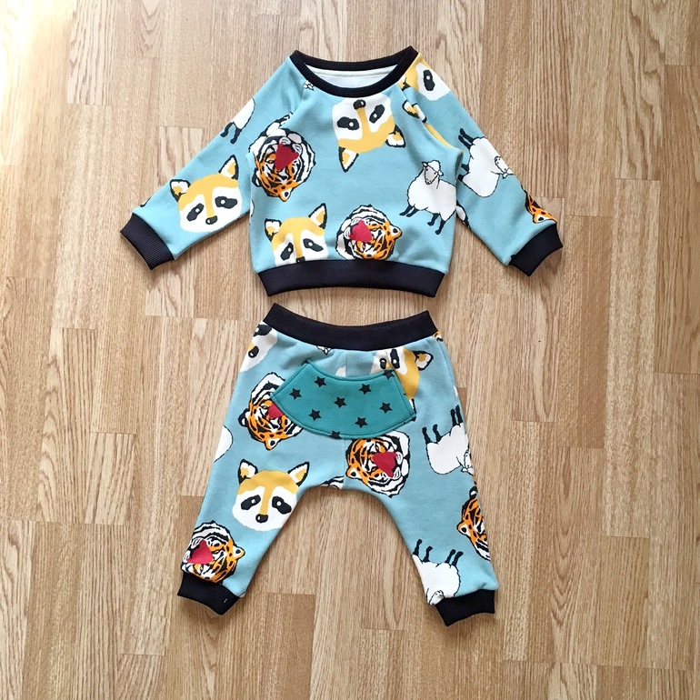 Второй комплект из этой ткани, в первый добавила горчичный соус футер, а этот сделала более мальчишеский - черная резинка вместо белой и звездочки на кармане спереди)