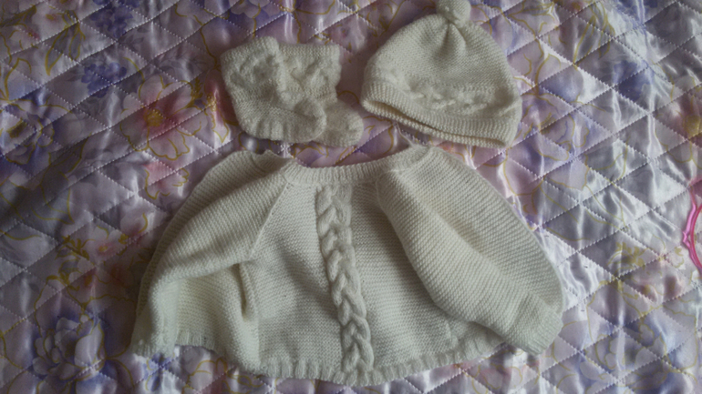 Вязание спицамивязала я зимой костюм на выписку, да штанцы не успела связать... зима у нас морозная, поэтому без теплого костюмчика никак...