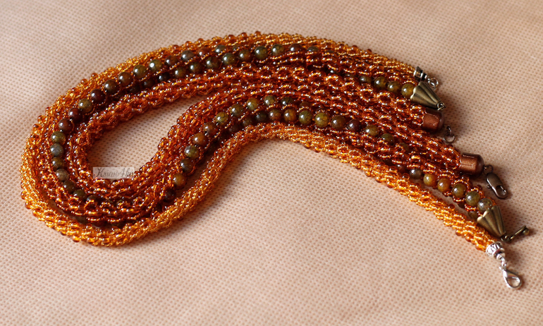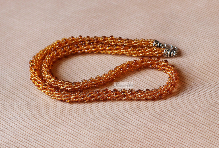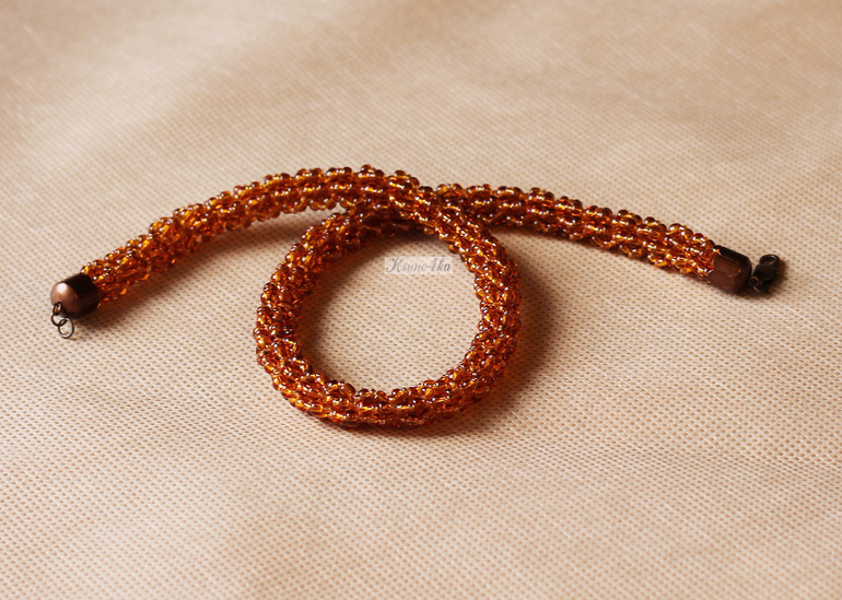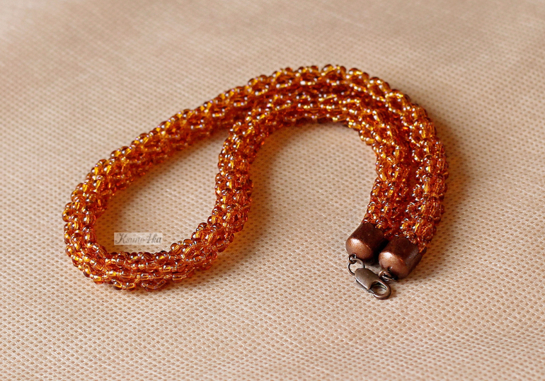 Жгут "Цвета янтаря..." выполнен из чешского бисера № 10 и № 6, фурнитура под медь. Длина 42 см. Так как от предыдущего жгутика остался крупный бисер, решила пустить его в дело.