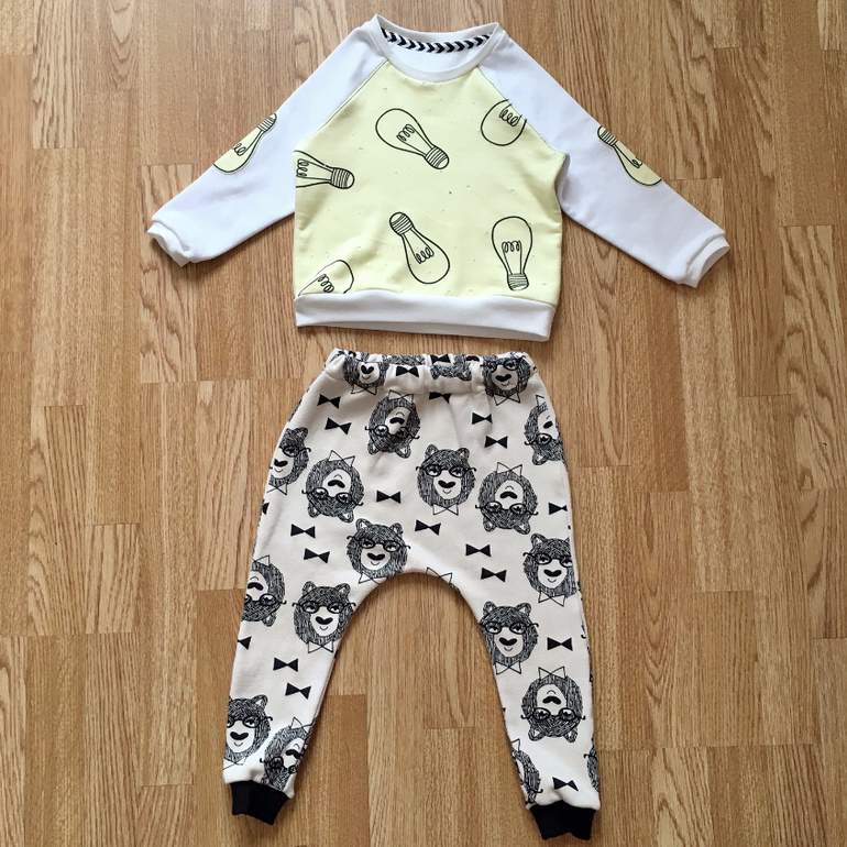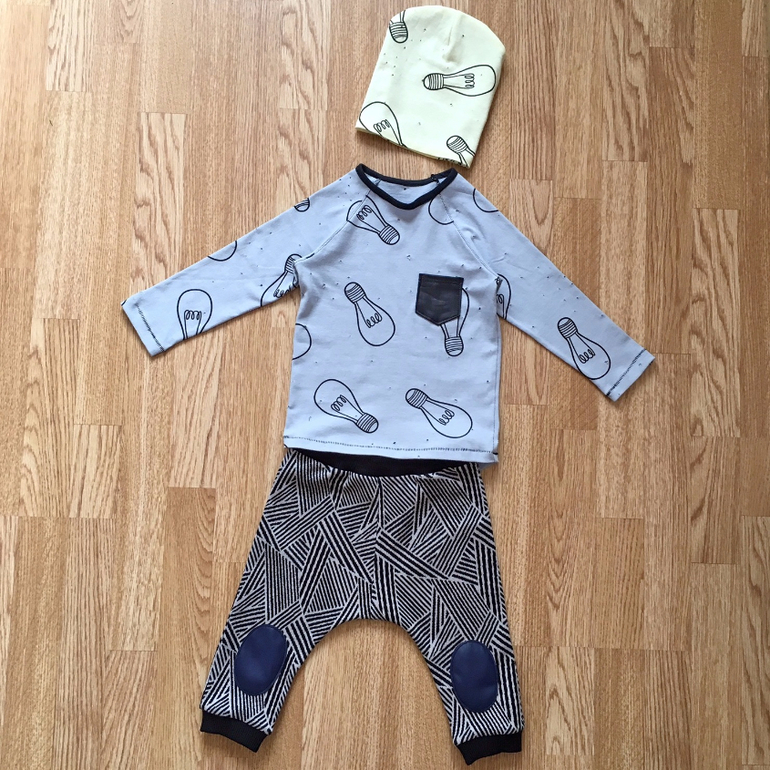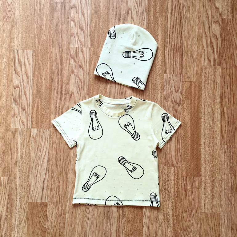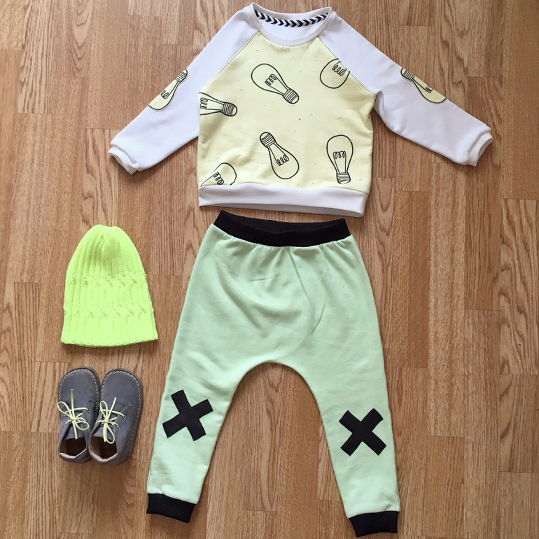 Шитье одежды, выкройки, ремонт одежды, шторы, швейные машины (уже приобретенные)Всем привет) Сегодня покажу сразу несколько комплектов. Как увидела эту ткань с лампочками - прям влюбилась) Цвет желто-салатный и серо-голубой. А еще она с дырочками - для летних футболок и легких шапочек очень клево смотрится) А для свитшота я ее продублировала белым тоненьким футериком) На свитшоте на локтях лампочки - аппликация.