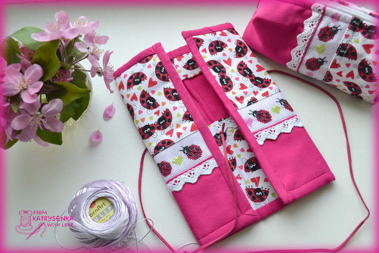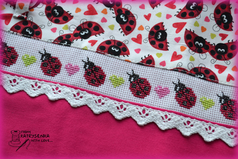 Использовала хлопок американский (с божьими коровками) и итальянский (вишнёвый), украсила вышивкой с божьими коровками и сердечками и хлопковым кружевом.
