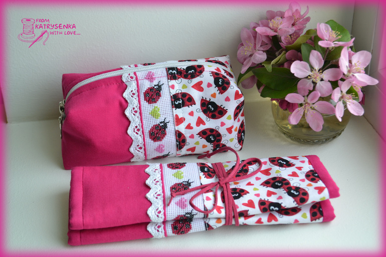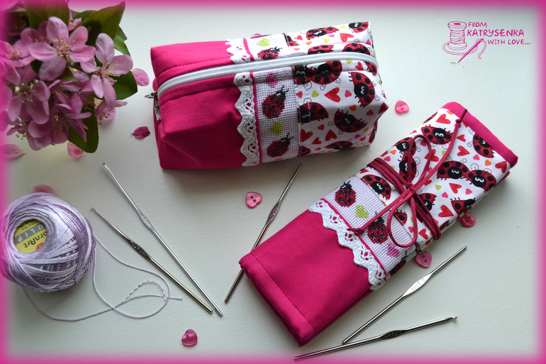 В комплект входит органайзер для спиц и крючков и косметичка-кирпичек для разных рукодельных нужностей)