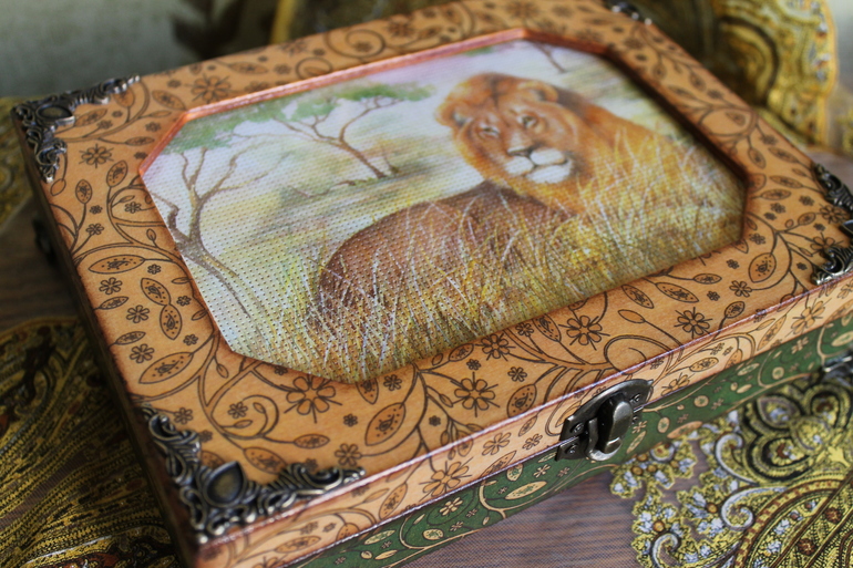 Изнутри крышка разбирается по типу фоторамки...Поэтому можно на место льва поставить любую фотографию....