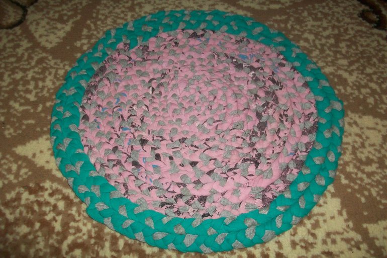 Всё просто и понятно: нарезать ткань на длинные полоски, сплести косички и по спирали собрать всё в коврик, с изнанки закрепив нитками с иголкой.