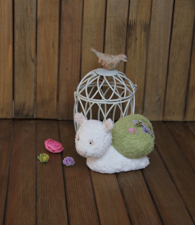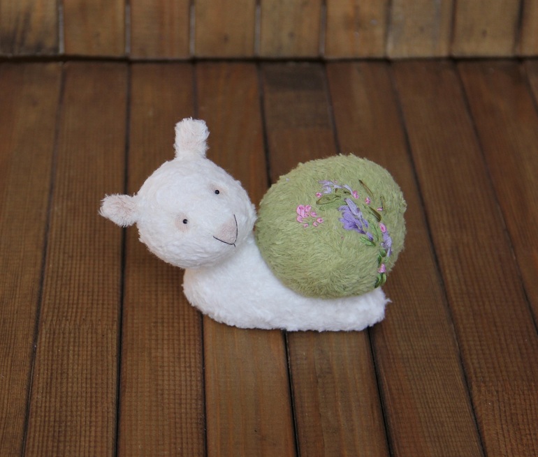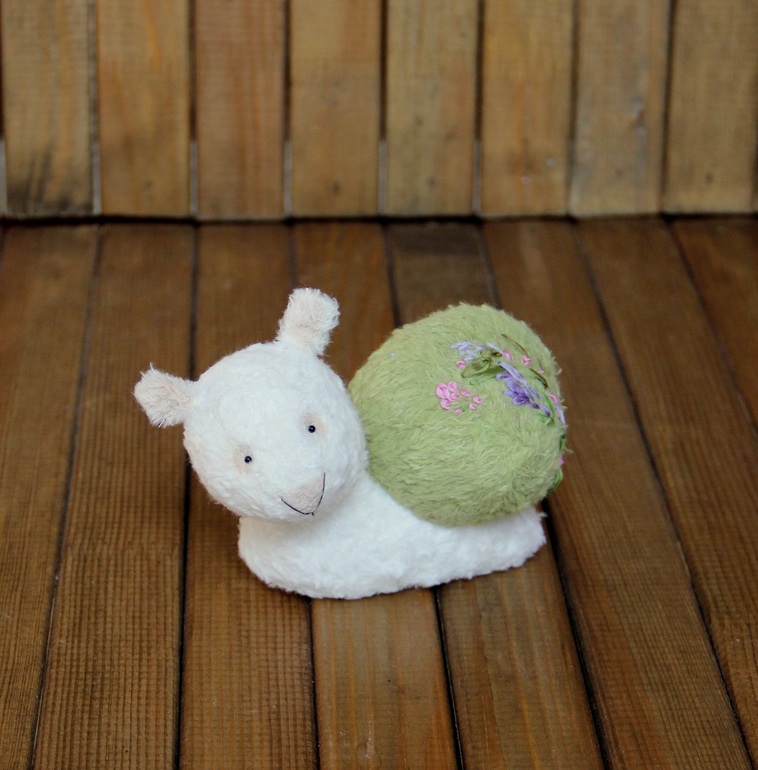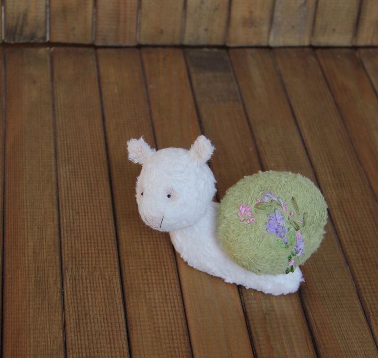 Тедди: мишки и их друзья.Мне очень нравится разглядывать вышивку лентами. Не так давно приобрела набор для вышивания шелковыми ленточками на тему луговых цветов. Немного пробую на моих игрушках: эту улитку тедди захотелось сшить с зеленой раковинкой и украсить сиреневыми и розовыми цветами.