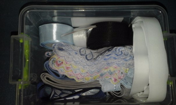 В следующем контейнеры - ленты, батистовые кружева, ремни для сумок, резинки для белья и липучка.