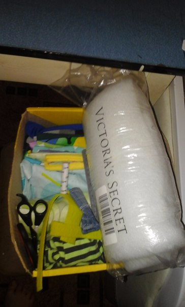 Возле стола на табуретки стоит коробка Укрпошти - в ней ткани, синтепон, ножницы, обрезки фетра