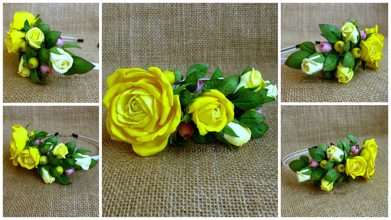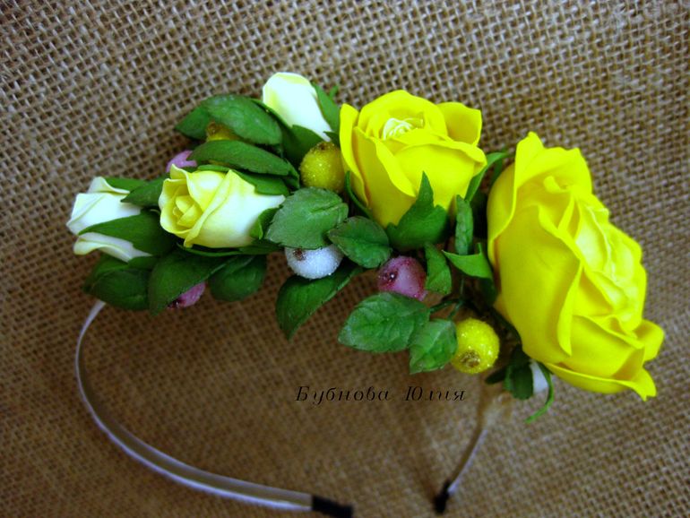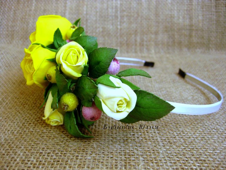 Ободок с веточкой желтых роз и сахарными ягодами.