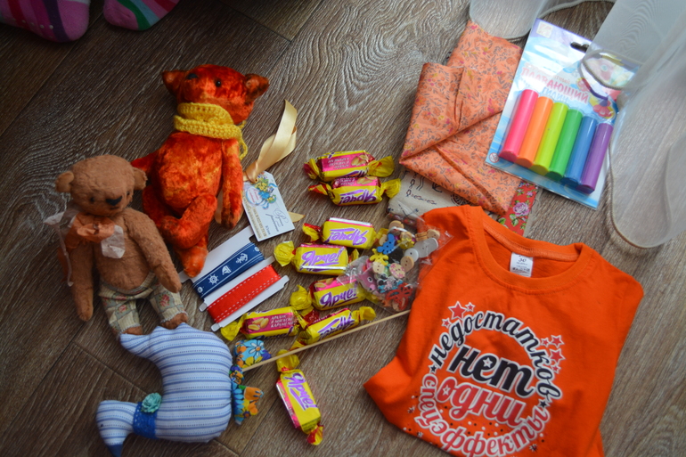Конфеток только половина, вторая половина была слопана сыном по дороге с почты. Еще не вошла раскраска. Как только пришли домой сразу же красить. Прикольная и яркая футболочка для Марка. Раскраска и необычный плавающий пластилин для нашего творчества. А еще Юлин гусик к пасхе украсит наш стол и куличик. Ну и отдельное спасибо от моего хомяка, тканюшки, ленточки, пуговки мммммммм.