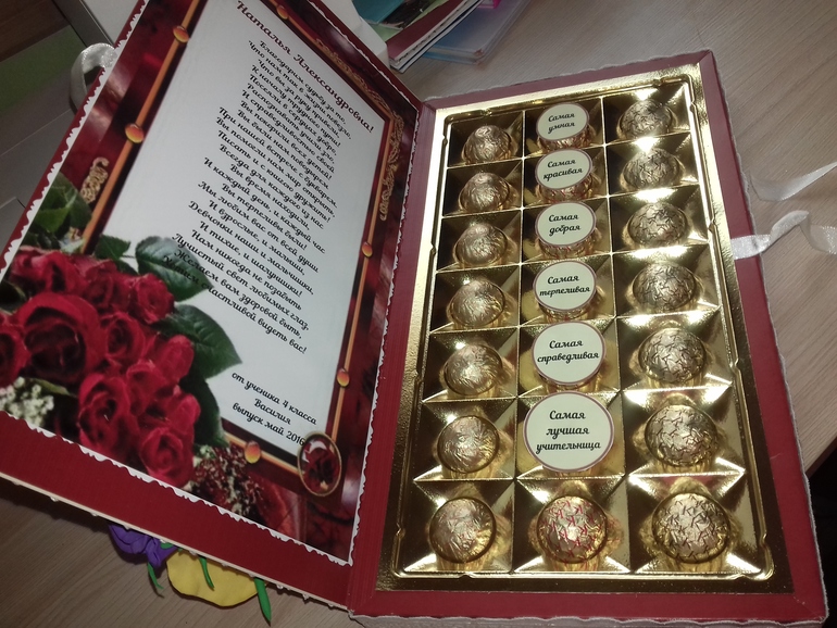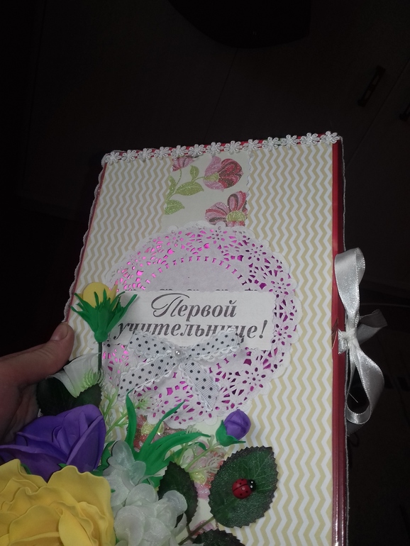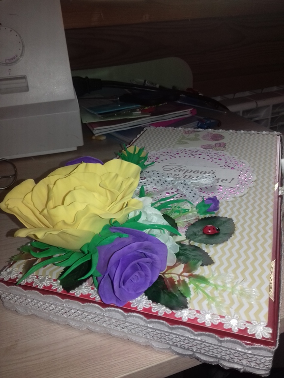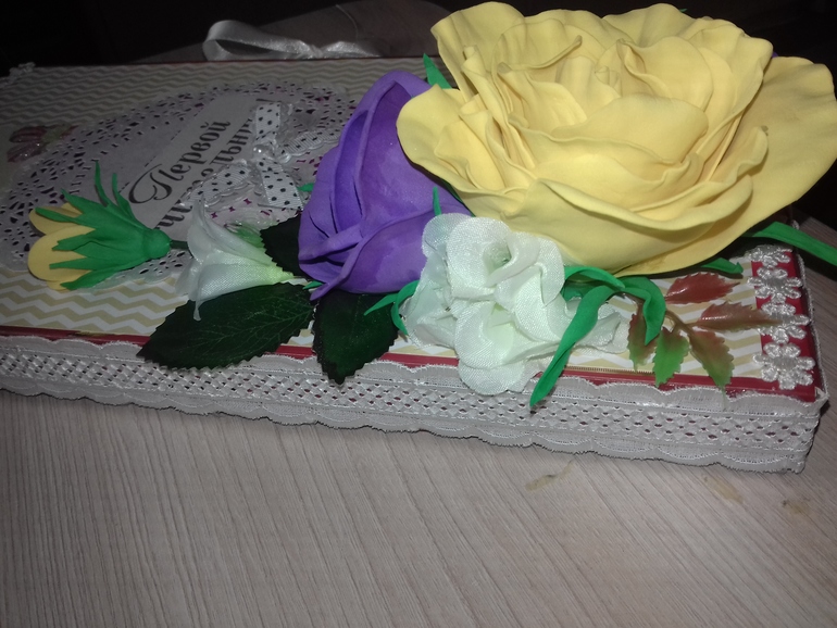 У всех такие шикарные работы,что свою даже стыдно показывать ((( Ну может хоть идея кому-нибудь пригодится ))) А всё началось с того,что я приехала за дочкой в садик и меня решили озадачить,как обычно ))) Но в этот раз была просьба не для сада...Ко мне подошла няня и попросила сделать подарок для учительницы со словами благодарности от её сынишки. Неожиданно было для меня,в основном я только шью и вяжу. Долго я думала,чтобы мне сшить,или связать...)))) Но в итоге я решила украсить коробку конфет ))) Очень давно хотела попробовать сделать цветы из фоамирана...попробовала и вот что получилось...Вы уж не судите меня строго!!!