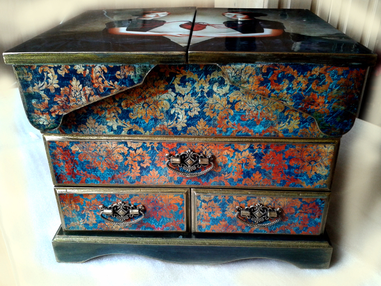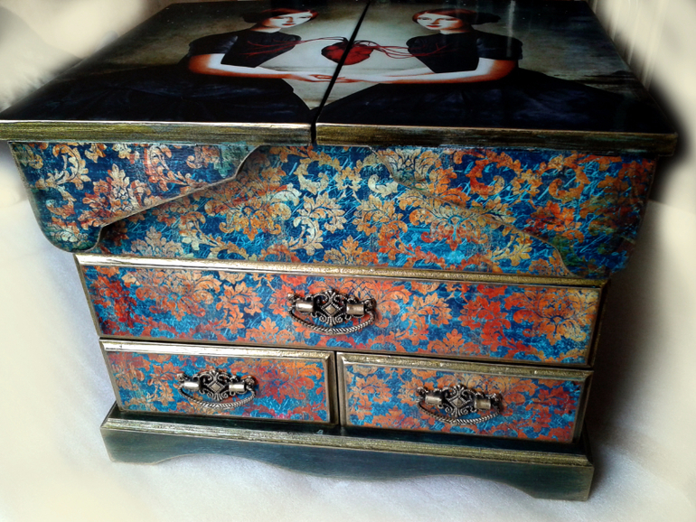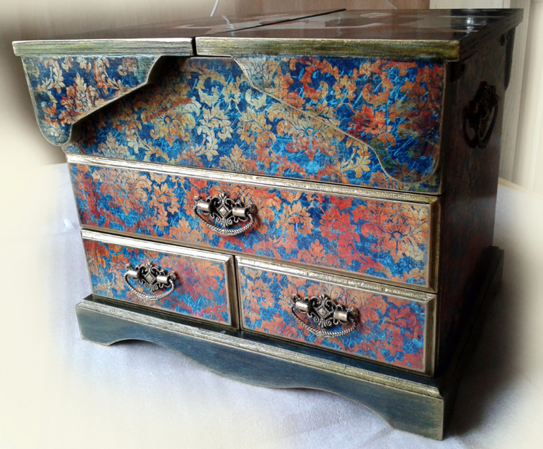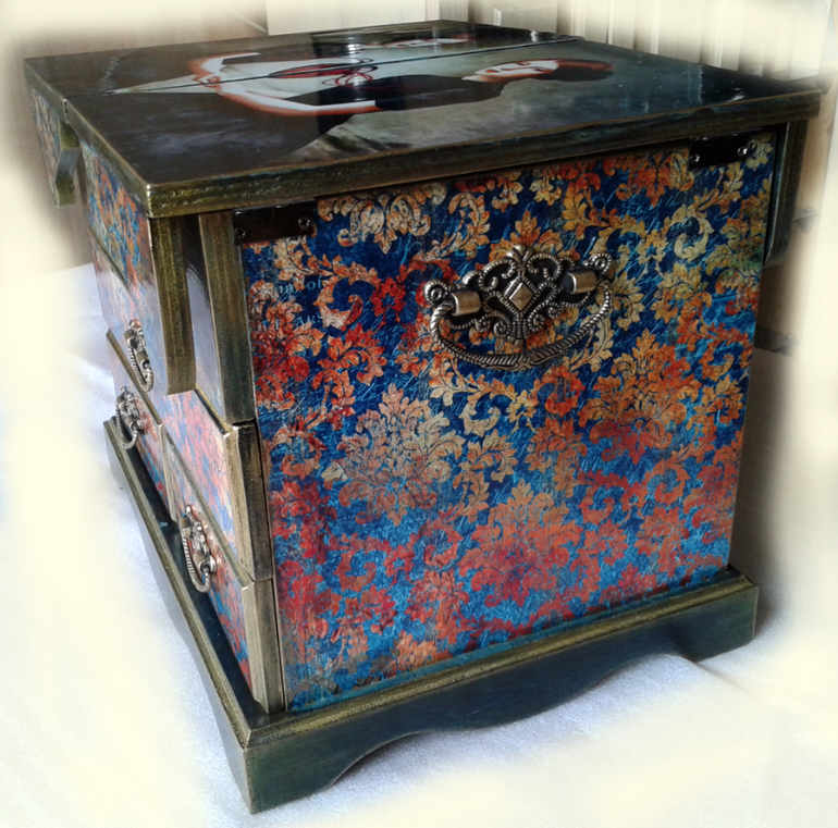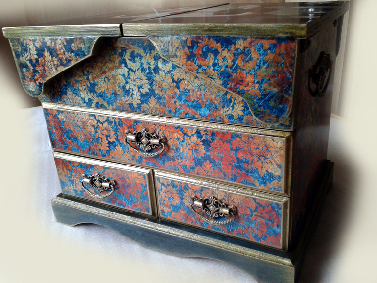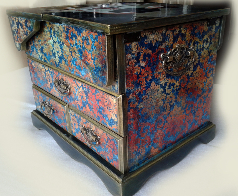 Юля, все до примитивного просто - лаковая распечатка, декупажная карта "Чип Арт" формата А3 (ушло без малого 3 шт.), строительный колер + черный грунт + краска "яркое золото" все разведено водой до консистенции водной морилки для тонировки, все фаски прокрашены краской "яркое золото" и изюминка всего декора золотой воск. Именно он дал такой нужный слегка зеленоватый оттенок всем тонированным поверхностям и свел воедино ДК и распечатку. Ну и фурнитура... она тоже тонирована золотым воском. После лакировки ДК приобрела свечение как будто она вживлена в поталь чего в действительности нет и в помине (пробовала на одном ящичке вживить в поталь - синий получился противного (совершенно неправильного) зеленого оттенка, пришлось все загрунтовать и клеить ДК просто на грунт.