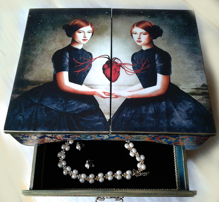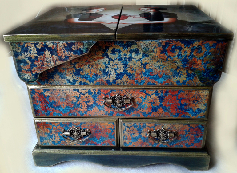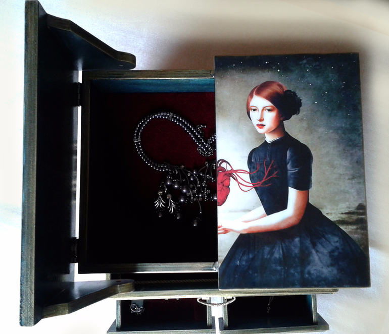 Фото как всегда делались второпях и в темноте и поэтому не видно, что внутри ящички обиты бархатом в тон сердца, средний ящик обит черным бархатом и декорирован золотым шнуром, в одном из нижних ящичков сделаны валики под колечки и серьги.
