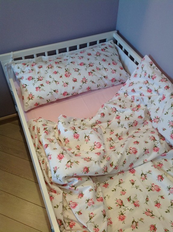 Шитье одежды, выкройки, ремонт одежды, шторы, швейные машины (уже приобретенные)Привет, всем! Сшила сегодня второй комплект постельного белья для дочки. Ткань перкаль. размеры не стандартные. Пододеяльник с одной стороны в розах, с другой розовый. Ткани не хватило с розами, но может и к лучшему) для разнообразия))) Под кат более 5 фото!!!