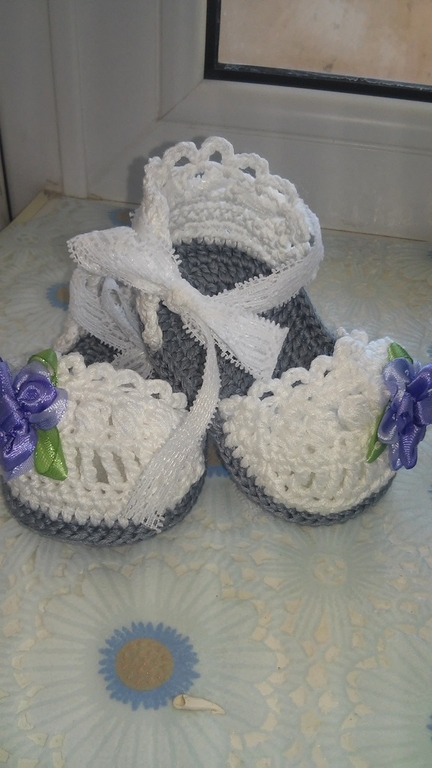 От Ирины мы получили просто очаровательные сандалики. Нежные и аккуратные (фото взяла у Ирины из поста, т.к. у самой не получилось их красиво отфоткать ((( Спасибо большое !!!!