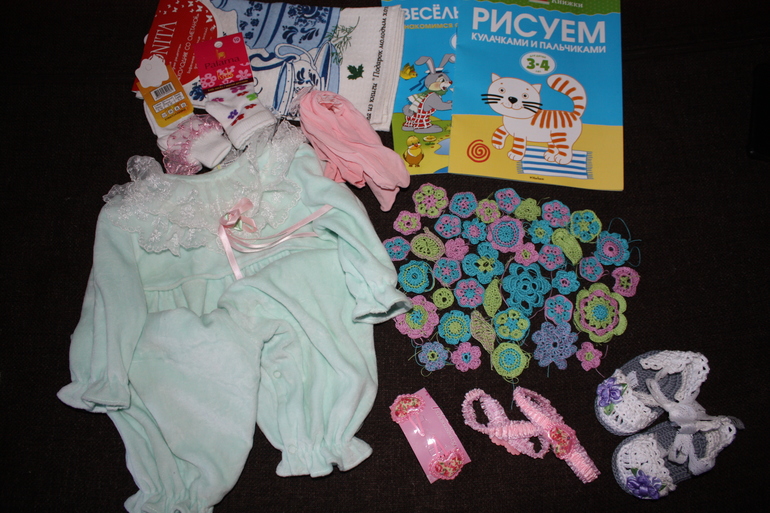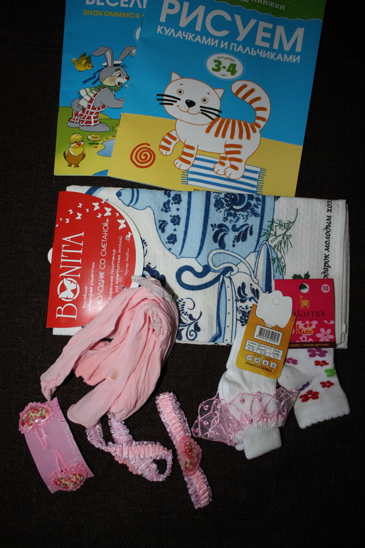 И вот такую посылочку с подарками мы получили от Елены. Книжечки сыну, полотенце, носочки, колготочки, повязочки на голову.