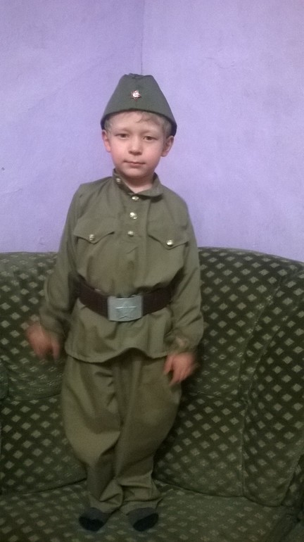 Шитье одежды, выкройки, ремонт одежды, шторы, швейные машины (уже приобретенные)Поздравляю с праздником Победы!!! Желаю всем мира и благополучия! Давно хотела сделать Захару форму, а тут в саду попросили к утреннику рубашку и пилотку. Пилотку купили, а рубашку, точнее гимнастерку я решила сшить, и к ней конечно галифе. Купила пуговки как на советской форме и солдатский ремень. Вот что получилось.