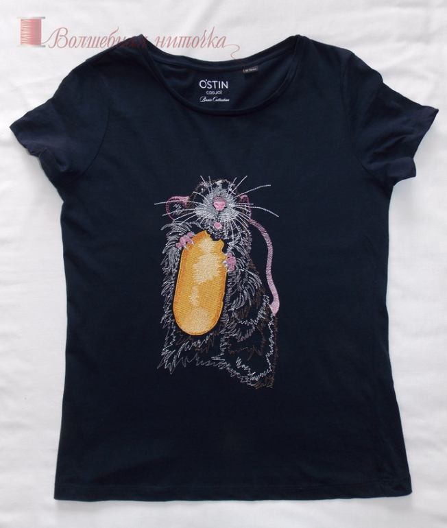Вышивка картин. Крестиком, гладью, бисером, стразами, лентами, схемы по вышивкам, процессыОчень понравилась картинка и я не удержалась, и вышила себе на футболке вот такого крысёнка с печенькой!)))
