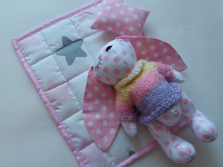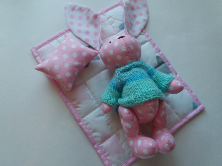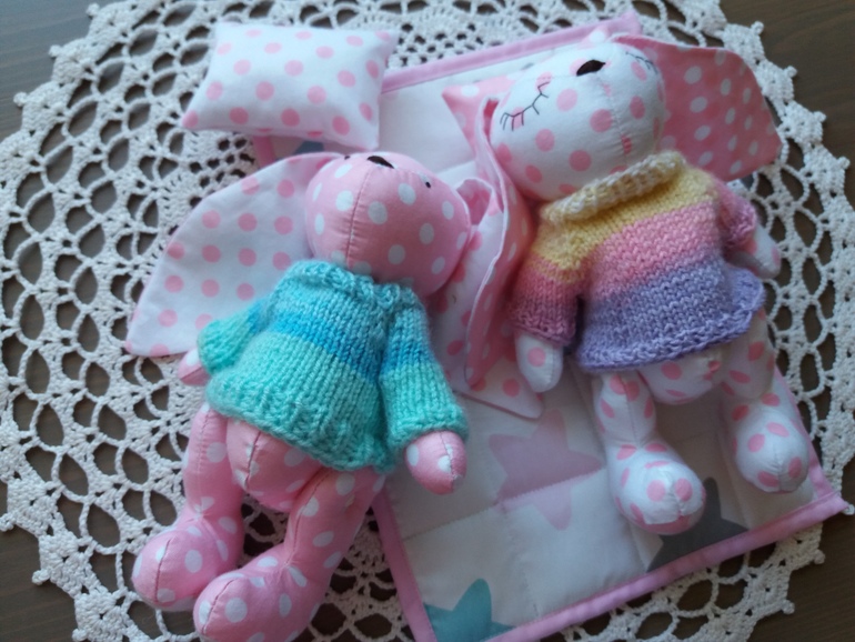 Игрушечный мир - животныеЗайки сшиты из хлопка, ручки и ножки на пуговичном креплении.Одеты в теплые свитерки.В комплекте одеялко и подушка.