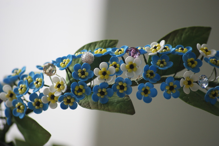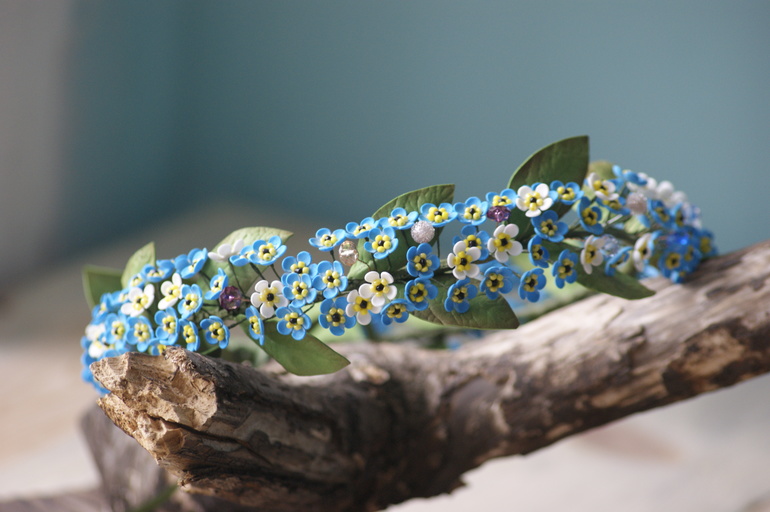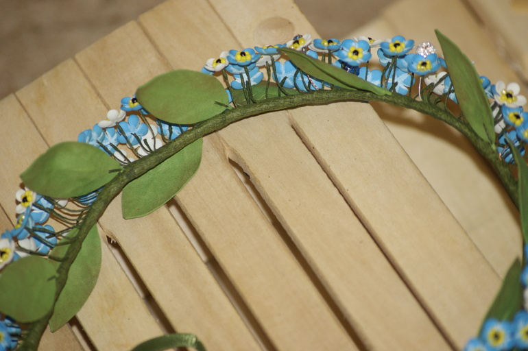 Цветы из ткани и форма. Канзаши. Украшения для волос.Всем привет! Сотворился у меня долгострой - веночек на голову с цветочками незабудок из фоамирана. Работа кропотливая и очень мелкая. Делала я его около месяца. Веночек состоит из 150 мелких (18 мм) цветочков. Серединки у цветков сделаны из желтого бисера. Сам веночек регулируется с помощью ленточек. P.S. Пост размещаю повторно, так как нечаянно удалила всю запись, о чем очень жалею из-за потеряных положительных комментариев.
