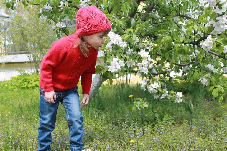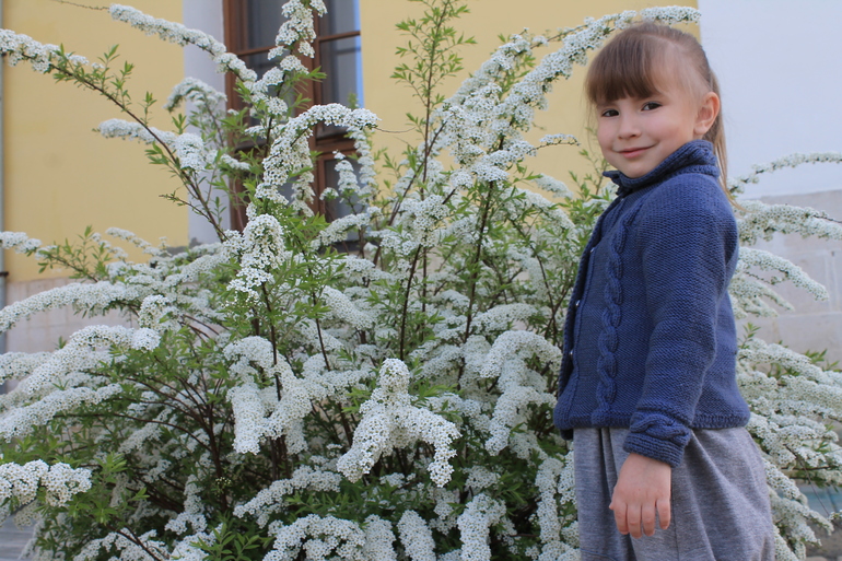 А эту кофточку я вязала вначале зимы, из б/у пряжи, вязала одевать под комбез зимой, вроде тепло и не видно, но пришла весна и дочь оценила эту кофтюню для прогулок, главное удобно и не жалко, что испачкает.