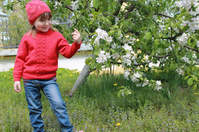 Замечательные работы!!! а доча ещё лучше (тьфу-тьфу). Напишите, пожалуйста, подробнее про свитерок. Пряжа какая? И особенно про узор спереди. по фото не разгляжу.