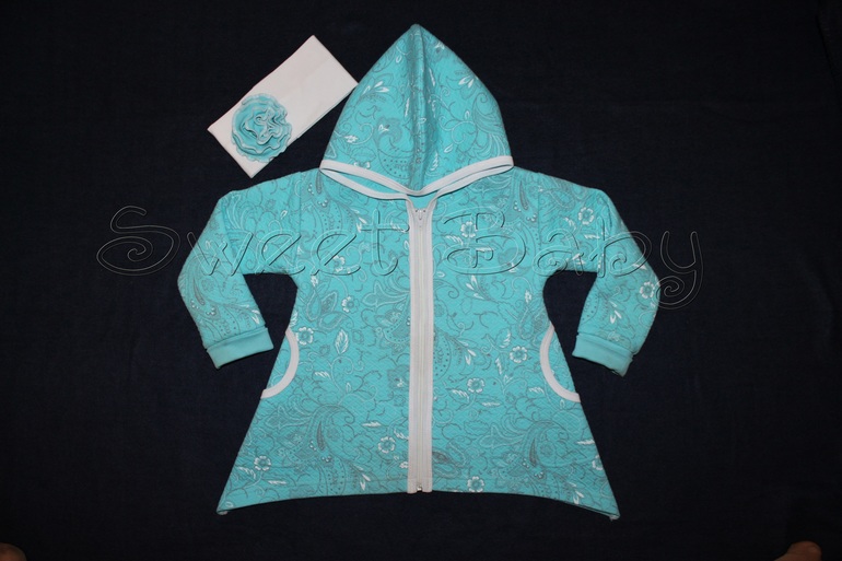 Вот такое пальтишко отшилось первым, дополнила его повязочкой из кулирки с лайкрой и цветочком из рибанки в тон