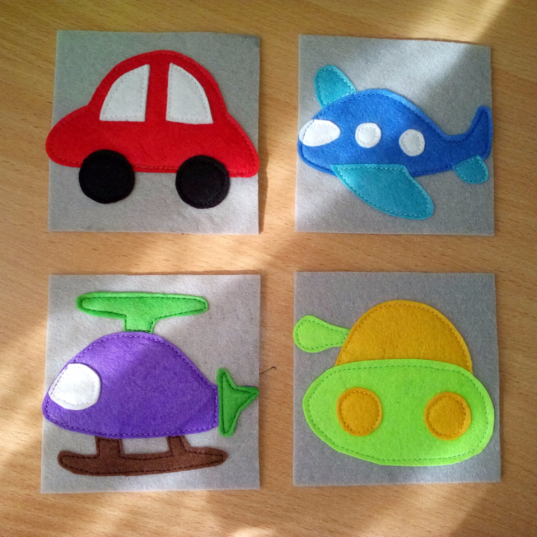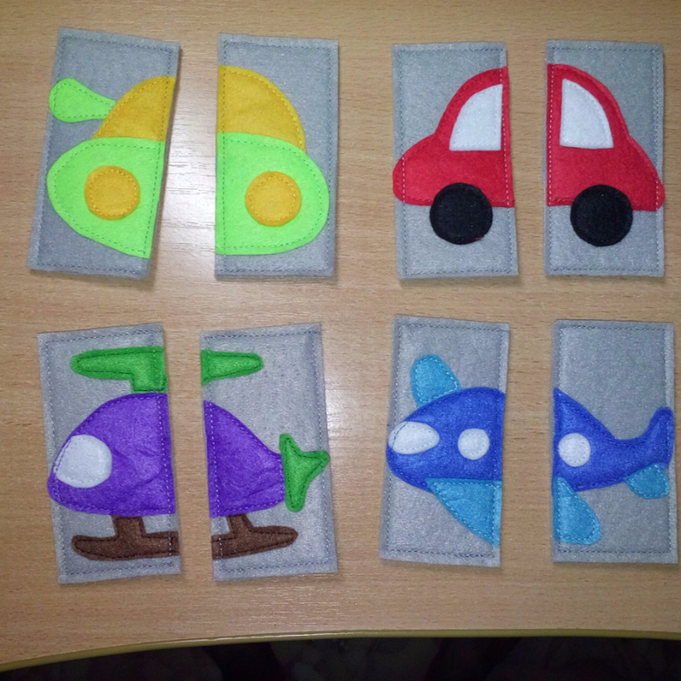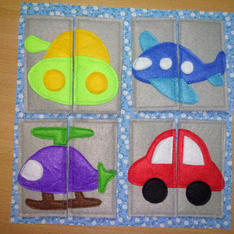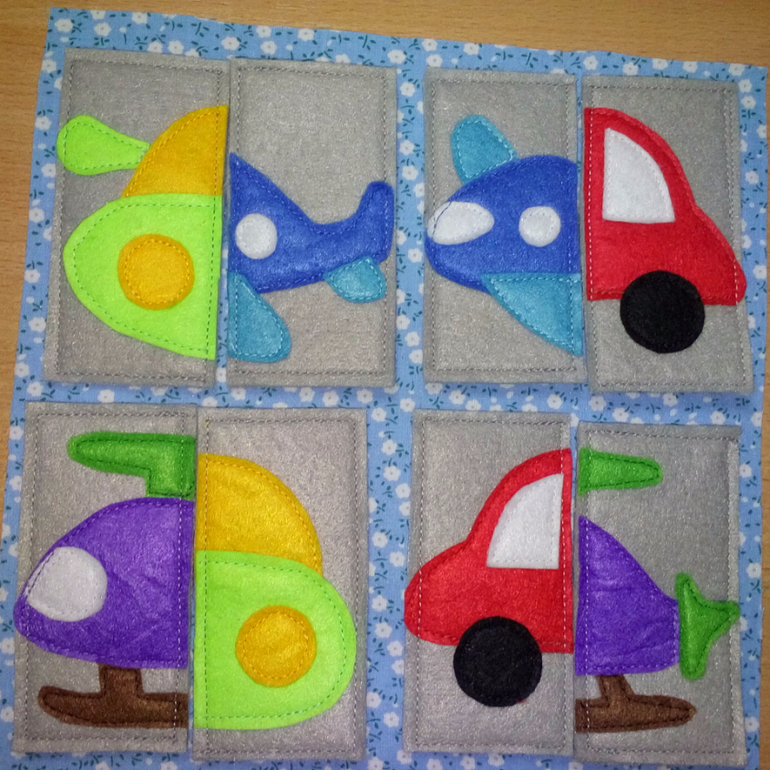Страничка называется «Пазлы», её основная развивающая и обучающая составляющие таковы: мелкая моторика (прикрепить/открепить фигуры на липучке), сенсорика (фактуры и цвета), познавательный аспект (найти половинки картинок и рассказ о транспорте).