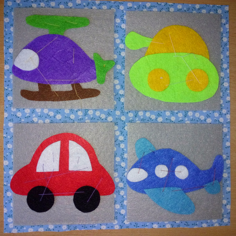 Материалы: фетр серого, голубого, синего, желтого, красного, белого, светло- и темно-зеленого,фиолетового цветов, пуговки, велкролента, хлопок и флизелин для основы.