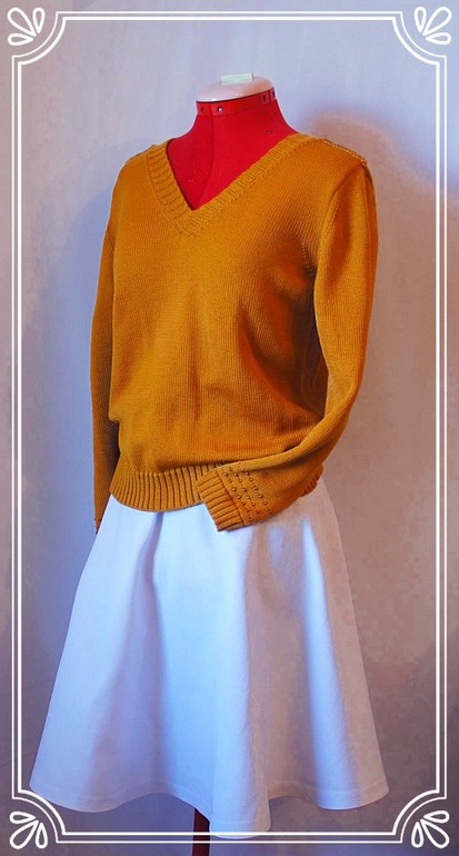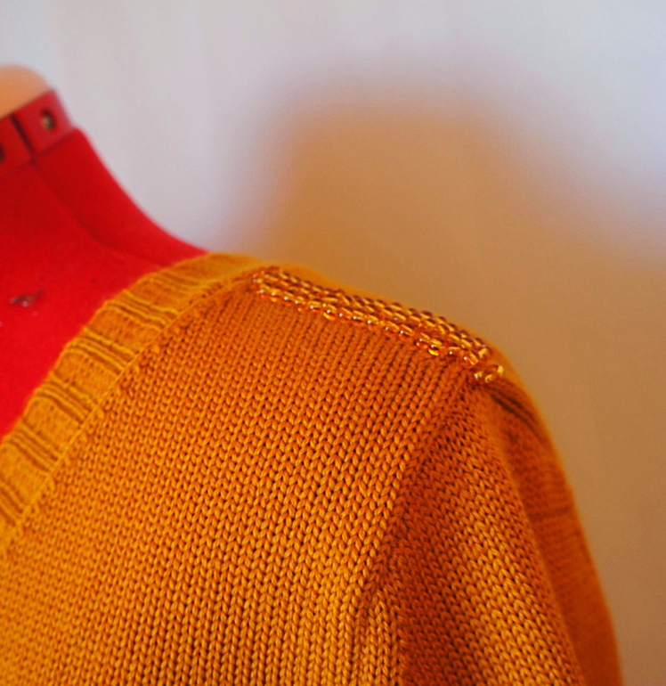 Кофта 90% шерсть мериноса 10% кашемир. на погонах и рукавах в ручную вложены бусины . На спинке вырез тоже V Юбка джинсы.