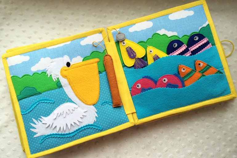 Третий сюжет - пеликан и рыбки! С помощью удочки мы ловим рыбок и кормим пеликана, он еще тот проглотик)) Рыбок 8шт, по паре)) ищем пару.