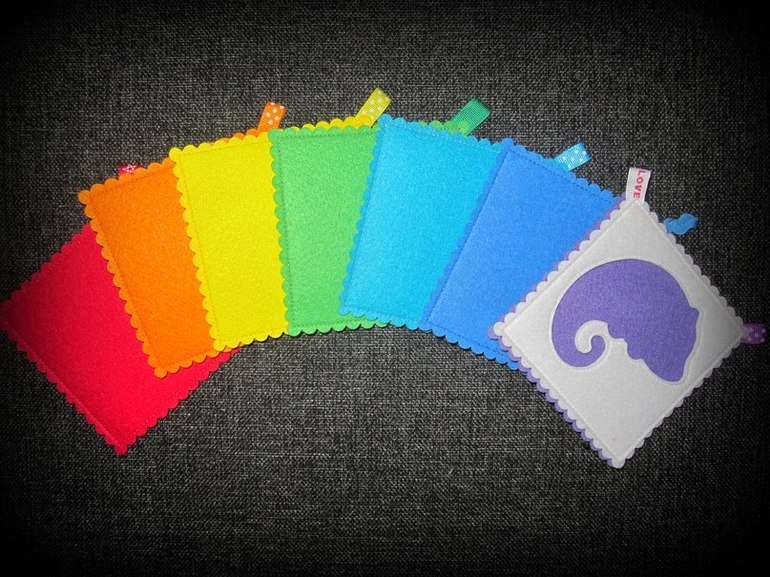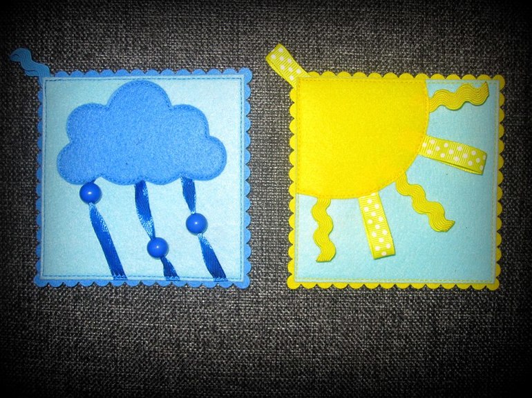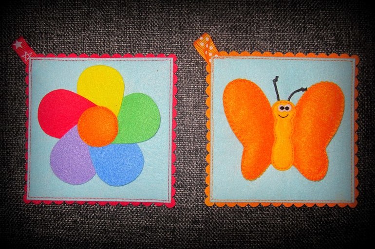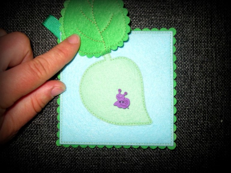 Развивающие игрушкиКнижечка немного отличается от предыдущей. Видоизменила цветочек (под каждым листиком прячется пуговка) + страничка "Хамелеон" (изучаем цвет).