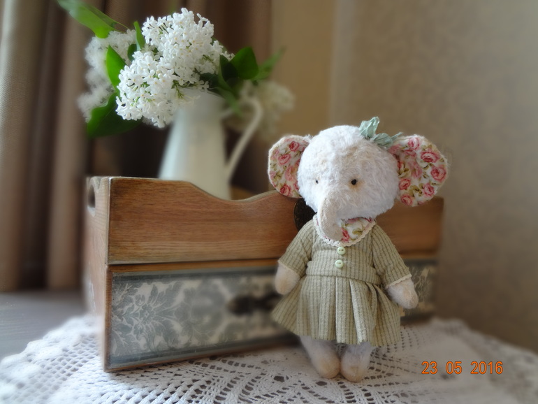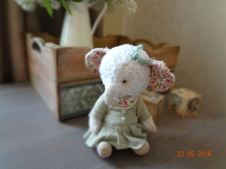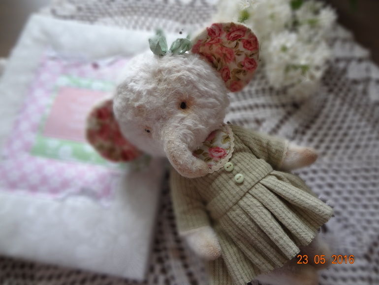 Тедди: мишки и их друзья.Слоня тедди сшита из вискозы ручного окраса,набита плотенько опилочками,в животике металлический гранулят. 6 шплинтов,голова покачивается. Стеклянные глазки. Платье из японского хлопка. Сшита слоня полностью вручную с большой любовью и теплом.