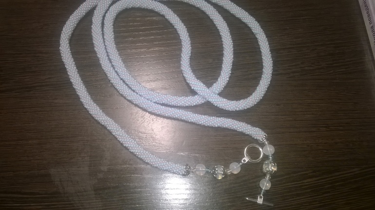 Голубой связан из чешского бисера нитками канарис и бусины луный камень