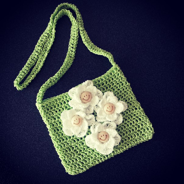 Вязание крючком (РАБОТЫ И СХЕМЫ)Связалась у меня еще одна сумочка с ромашками-смайликами :) уж очень мне понравилось вязать такие, маленькая, летняя и такая девочковая на этот раз в зеленом цвете, ну и ромашек прибавилось :)