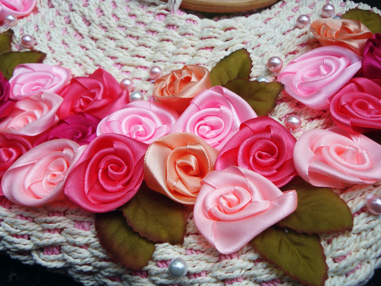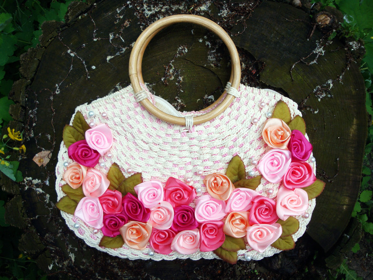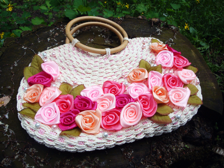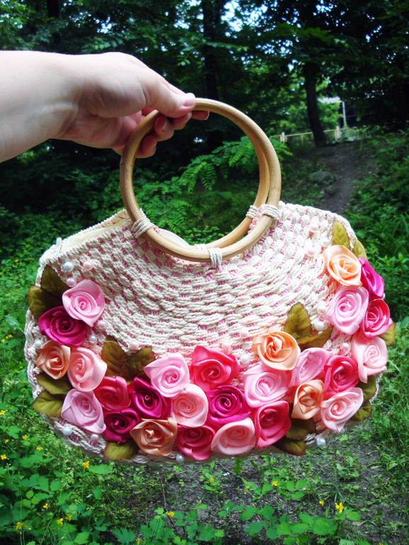 Оригинальная плетеная сумочка с декором из атласных роз ручной работы.