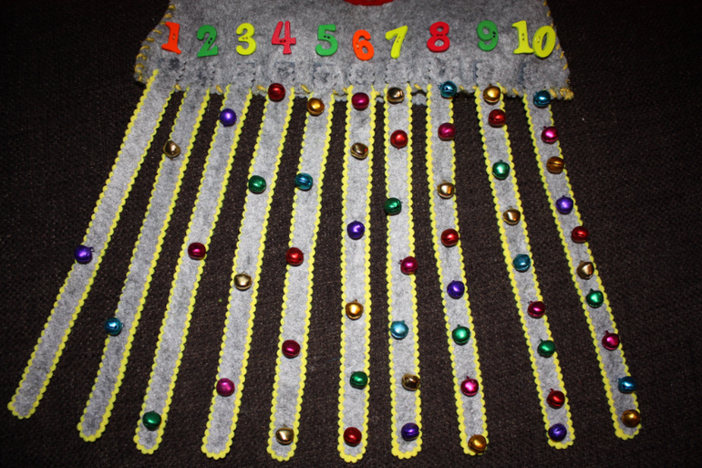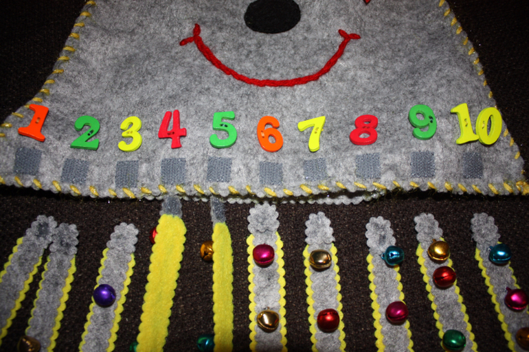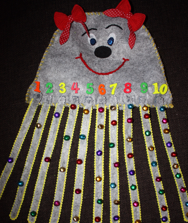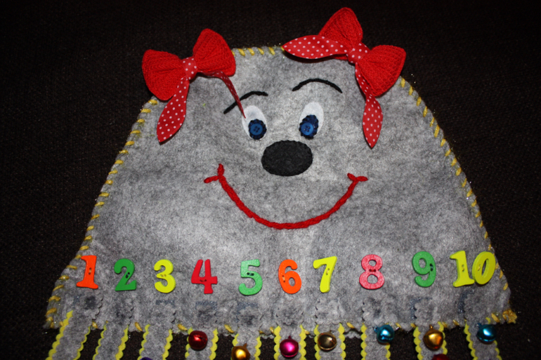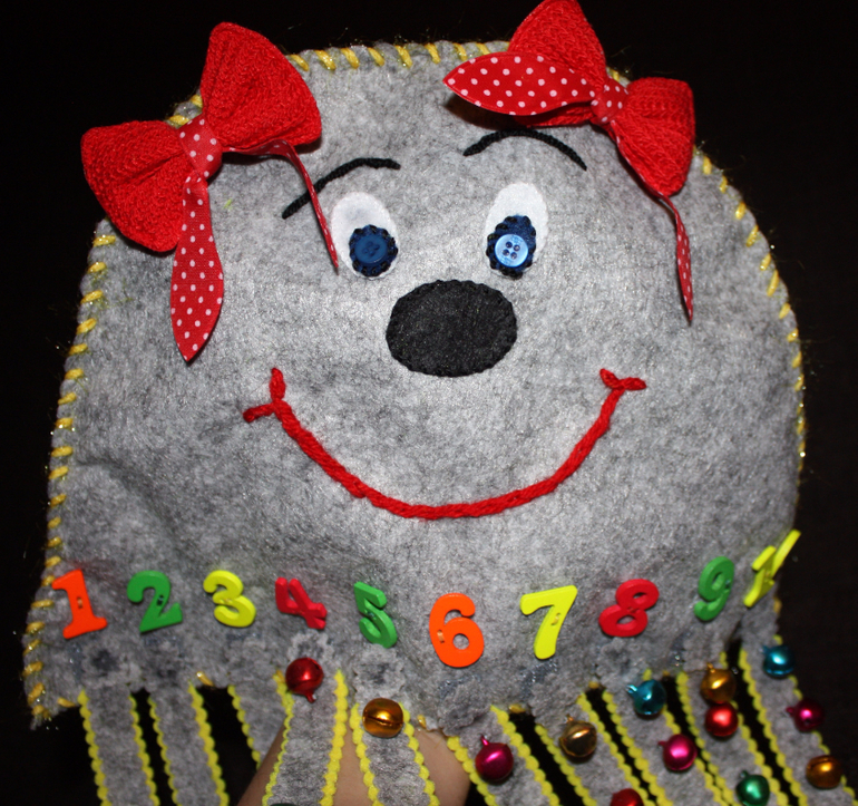 Хотелось нашить на щупальцы пуговки от 1 до 10 и на липучках прикреплять их к туловищу. Но.... в таком случае цифры были бы по кругу на теле осьминога. А мне хотелось, чтобы они были в ряд, чтобы ребенок видел последовательность чисел. Так и появилась эта медузка с щупальцами осьмножки ))))) Не стала ее делать объемной внутри, а сделала так чтобы ее можно было одеть на руку. И тогда ребенку будет интересней.. Одеваешь и просишь его помочь найти всем ножкам свое место. Моему ребенку точно такие просьбы нравятся. Так ребенок и будет тренироваться в счете. Посчитал и прикрепил к нужной цифре. На ножки пришила не пуговки, а бубенчики. И они так здорово звенят.. Уххх, от этого еще интересней будет играть. Вот как-то так ))))