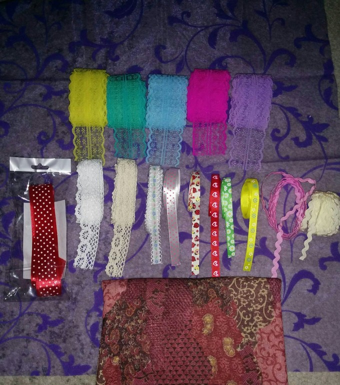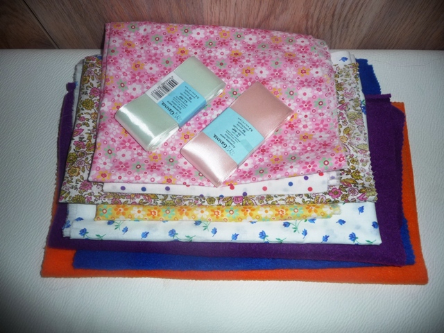 Кусочки тканюшек разного размера (флис примерно 40х40, остальные побольше) и ленточки.