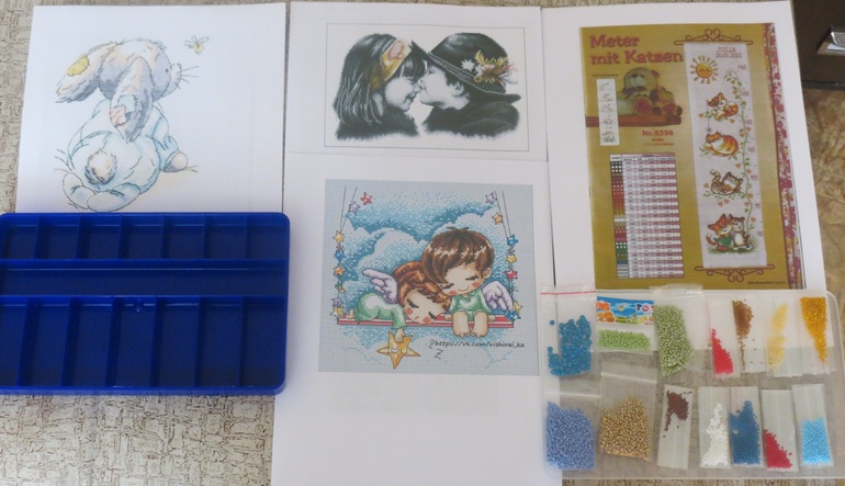 Три открытки, новая вышивка от Риолис Веселая пчелка, пакетик с крупными бусинками, пакетик со стеклянными слезинками, пакетик с полу бусинками и цветочками, ленточки разной ширины и длины, 6 туб для бисера, небольшой отрезок органзы или вроде того, браслетик с шармиком ножки, лента золотистого цвета с металлическими краями.