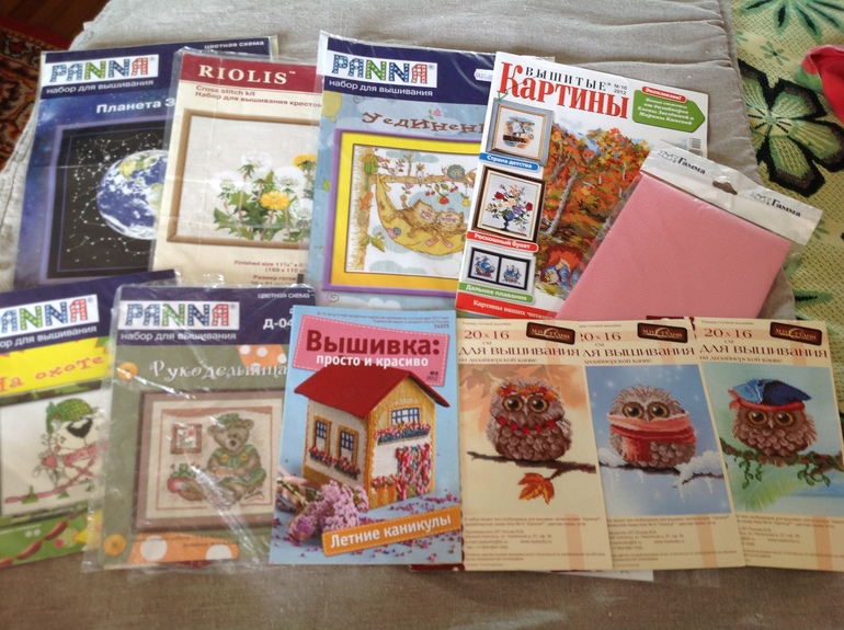 Вышивальный слоник. Остатки наборов панна и риолис, Схемы от наборов с совами, 2 журнала и канва розовая 50х50 см