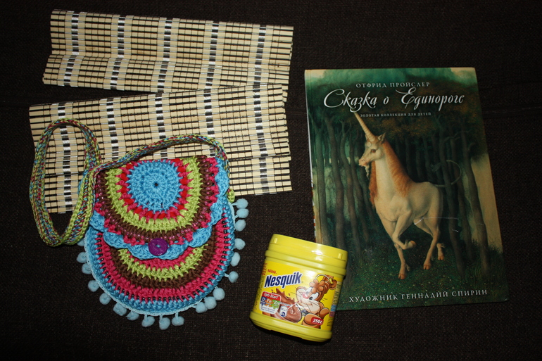 Получили мы подарочки в виде ковриков, несквика и очень милой книги про единорога. Мы ее сразу стали читать в парке, куда отправились после почты. Очень классная книга и иллюстрации очень сказочные