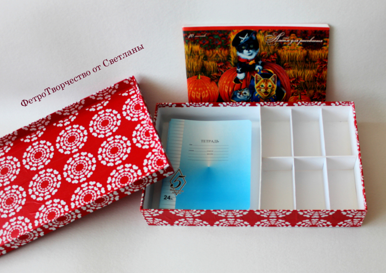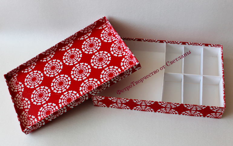 Натали, вот как клеить коробочки я уже знаю , а вот чем и как обклеивать только экспериментирую. Внутри белый -это ватман , мне он понравился в работе . А снаружи красное - это фетр . На него я сначала пришила аппликацию, а затем приклеила его на крышку .
