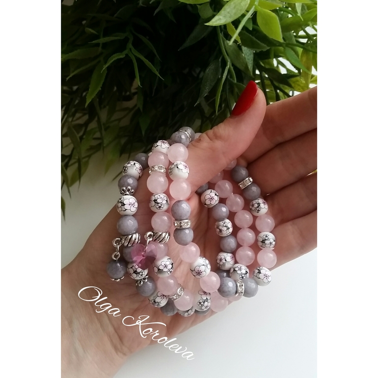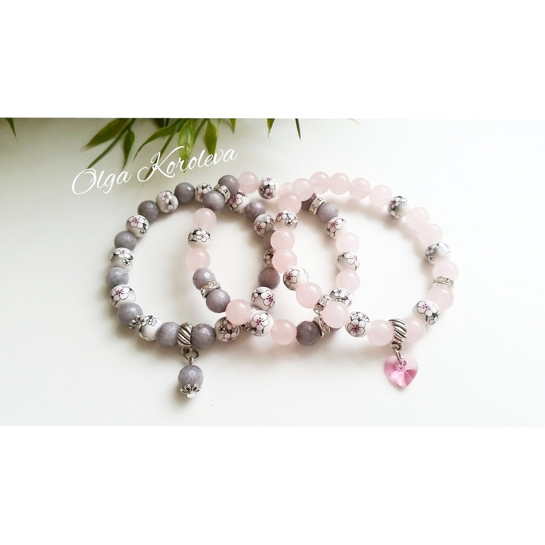 Бижутерия для слингомам. Слингобусы. Грызунки.Вдохновившись кристальным сердцем Сваровски, сотворила сегодня этот нежный комплект из розового кварца, серого тонированного агата, керамики с рисунком "Сакура" и подвески-сердца от Сваровски.